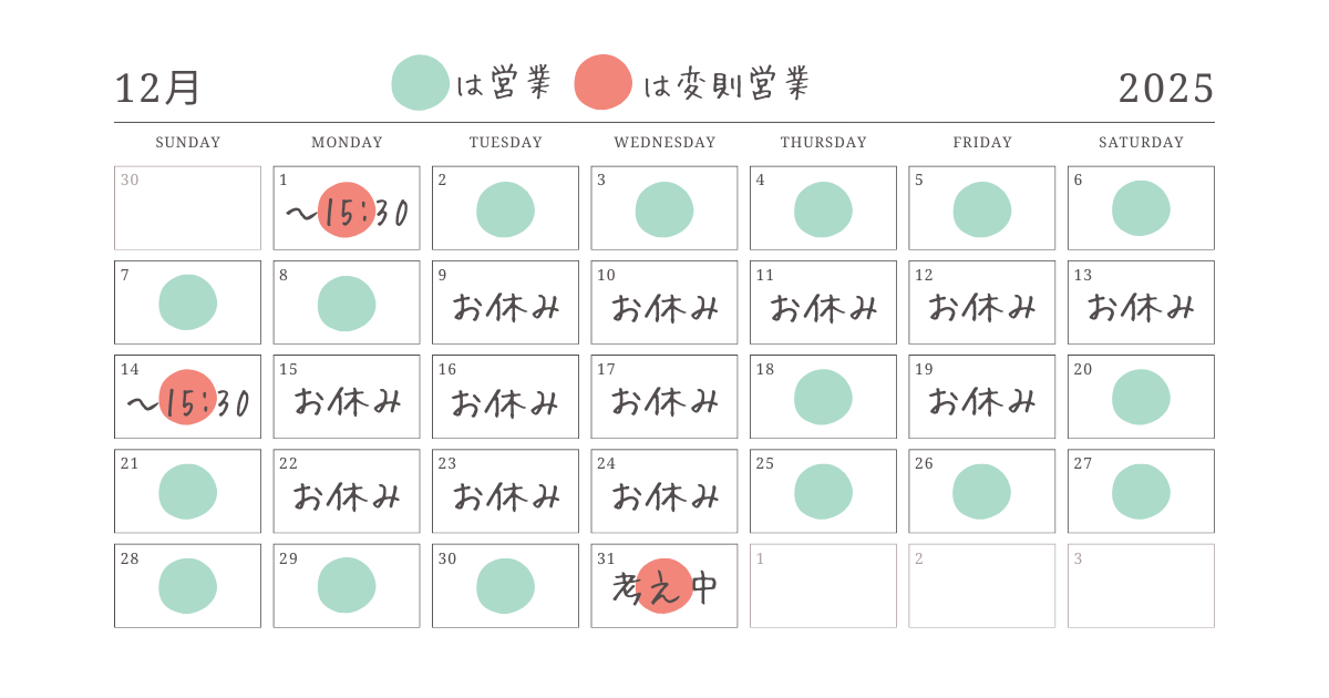 (12/09 カレンダー変更 14日変則営業、15・16日は店休へ)