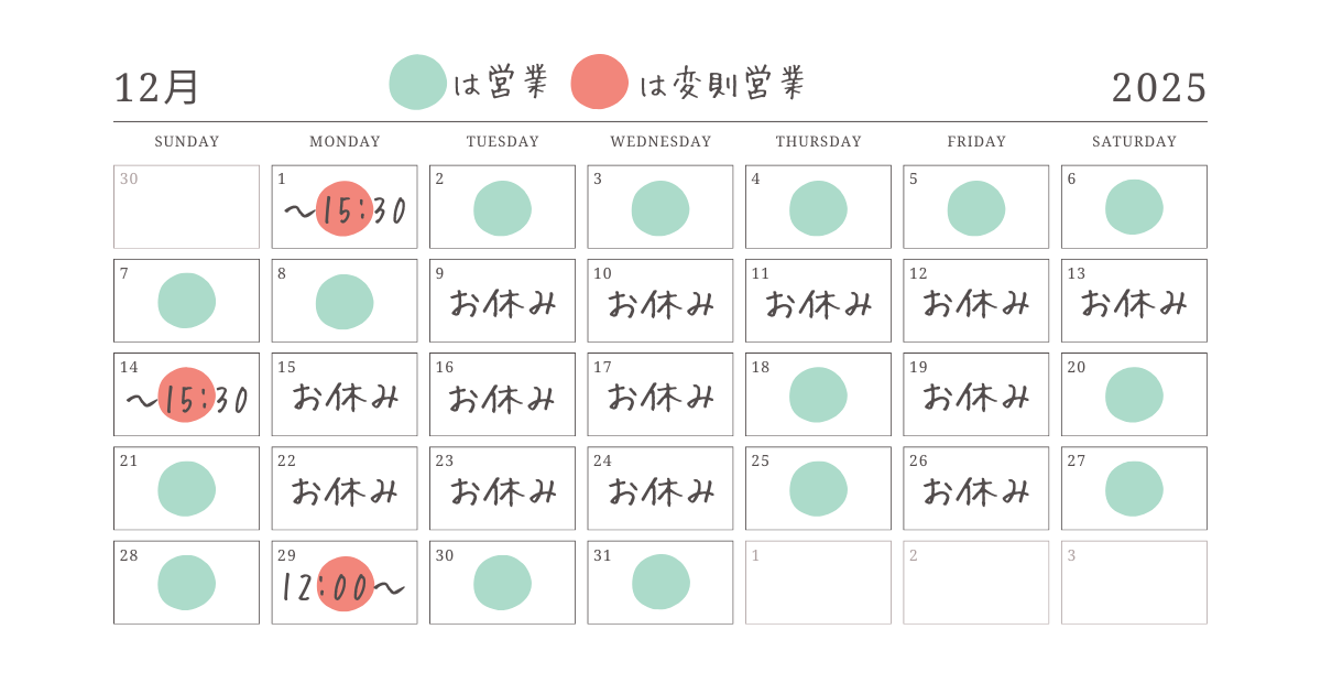 (12/25 カレンダー変更 26日は店休日、31日は通常営業へ)