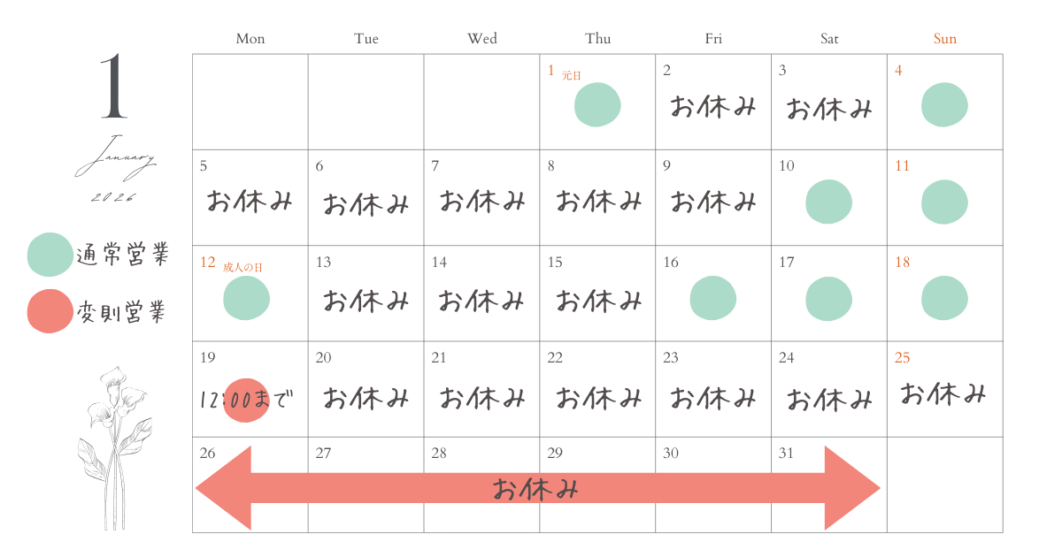 (12/27 カレンダー変更 5日・6日が店休日へ、9日が営業日へ)